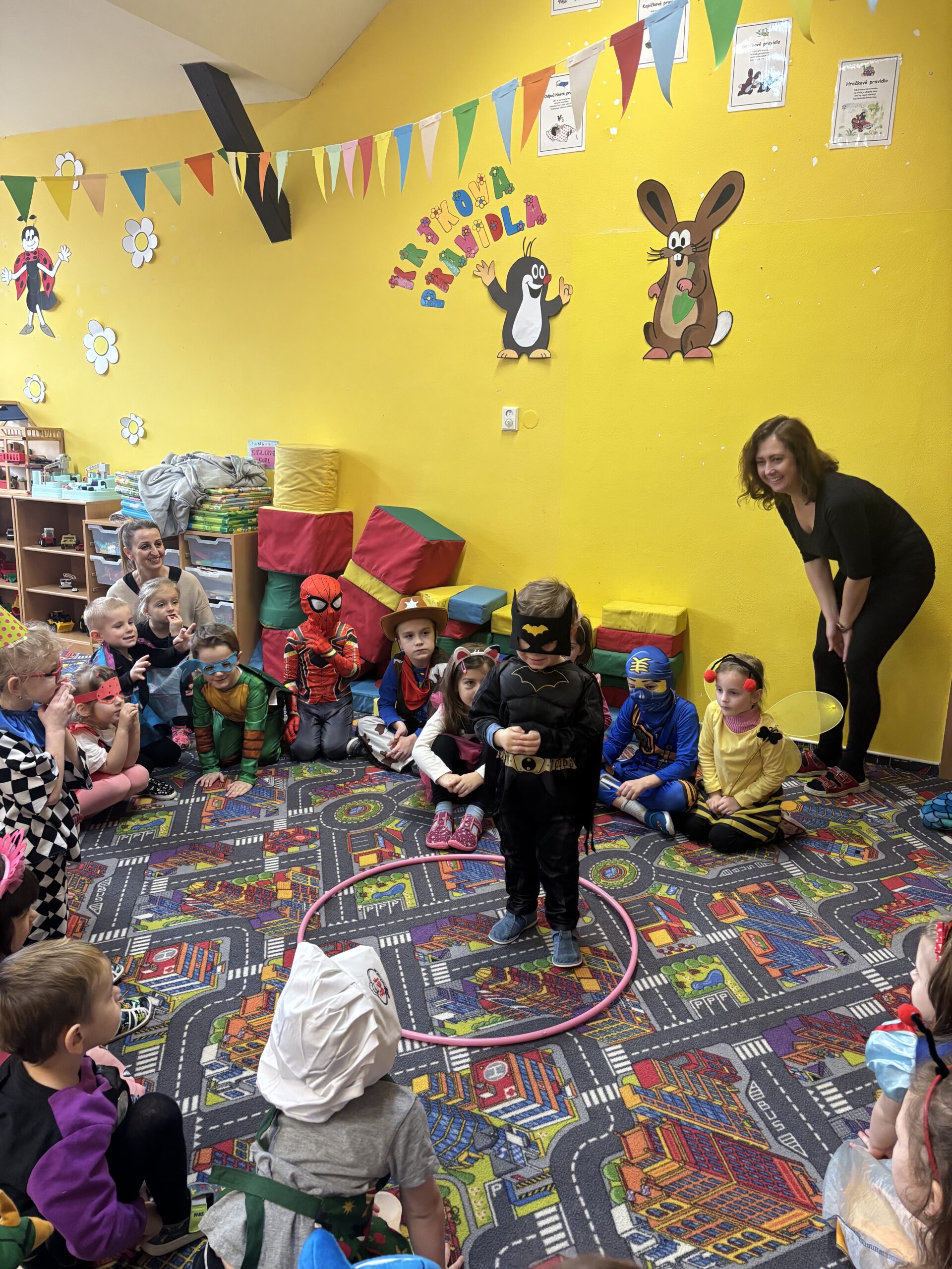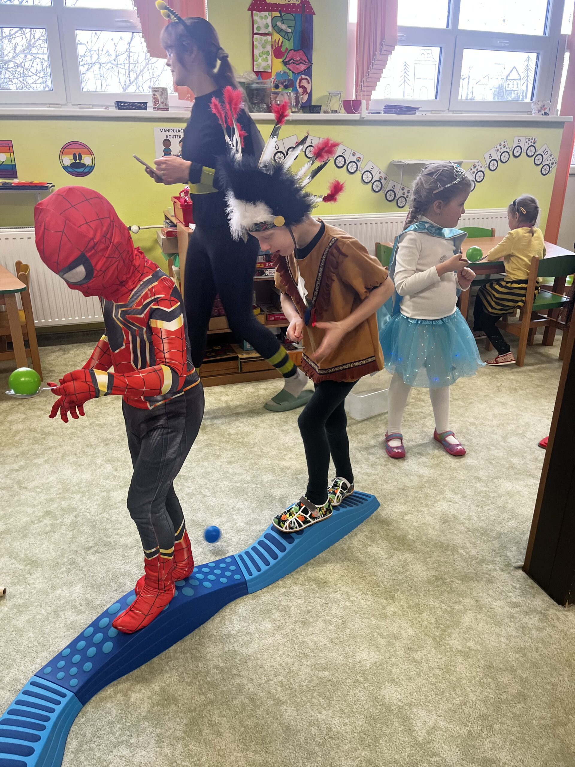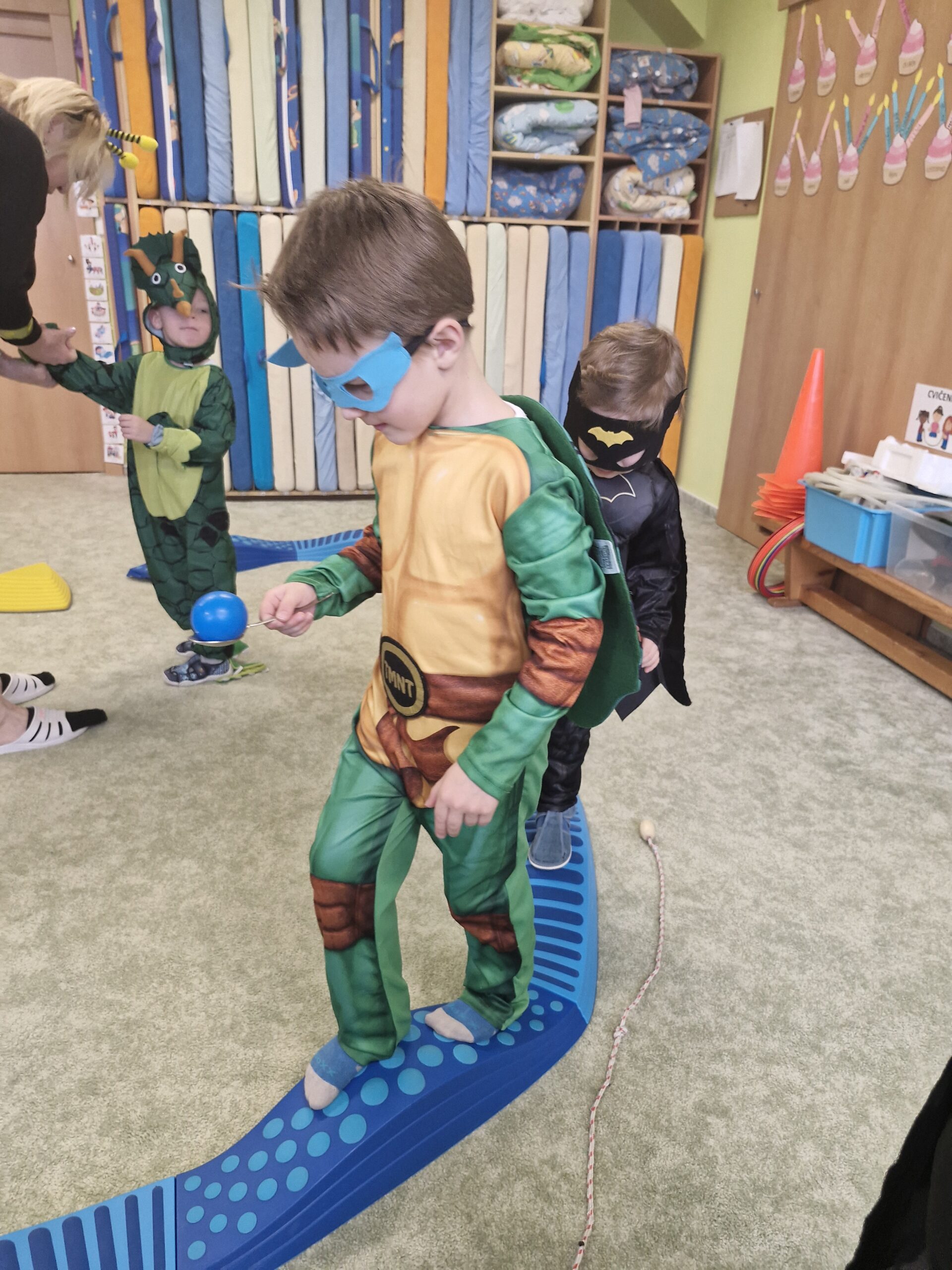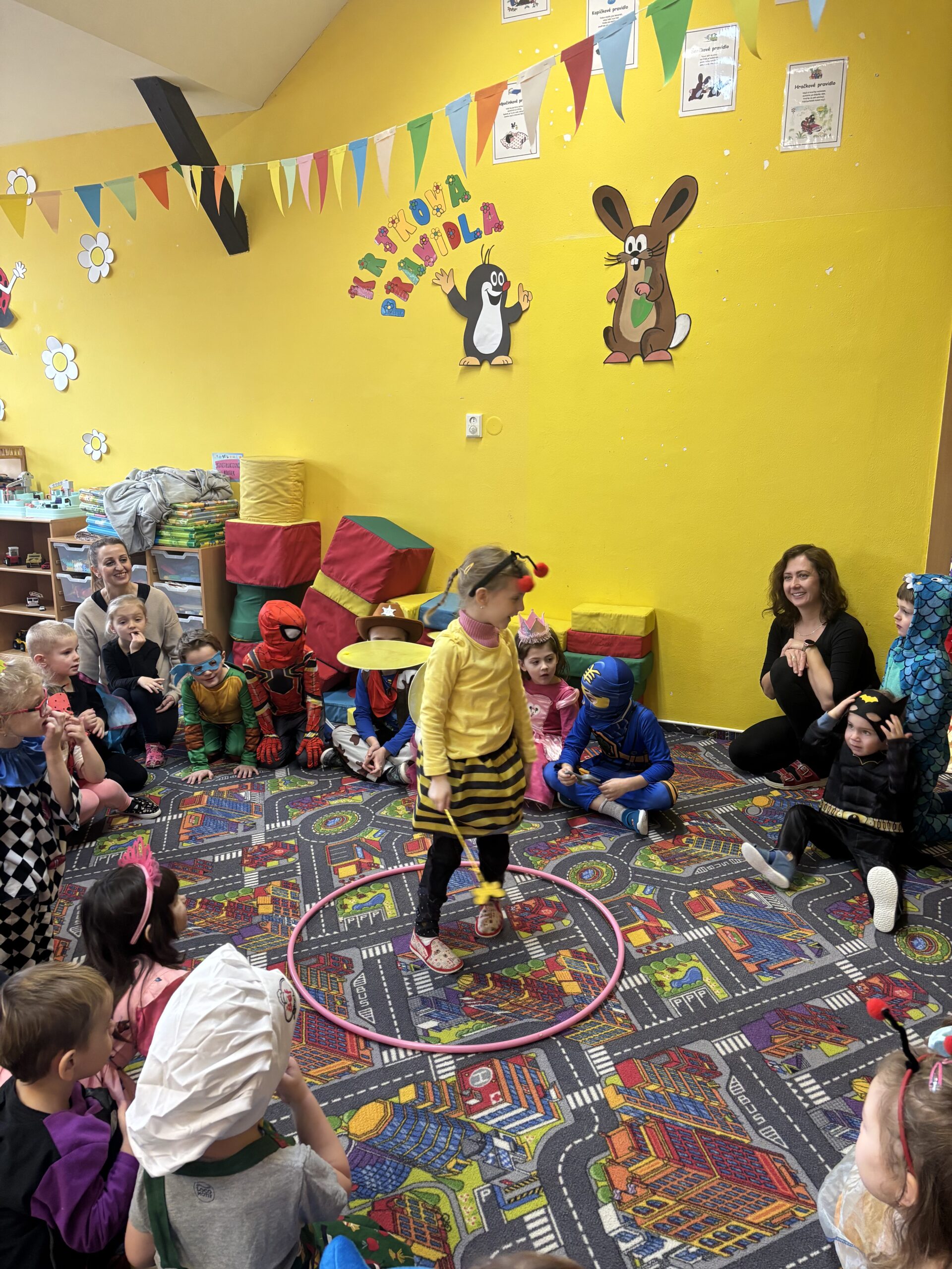 Poté děti pomáhaly pilným včeličkám s přenášením pylu do úlu a pustily se do plnění připravených karnevalových stanovišť. Děti postupně navštěvovaly jednotlivá stanoviště a vyzkoušely si například přenášení míčku na lžičce po vyznačené dráze, hod míčkem do šaška, hledání bonbonů v kuličkovém bazénku nebo namotávání bonbonu na provázek. Nechyběly ani oblíbené pohybové hry jako kloboukovaná, židličkovaná a prolézání pod tyčí.