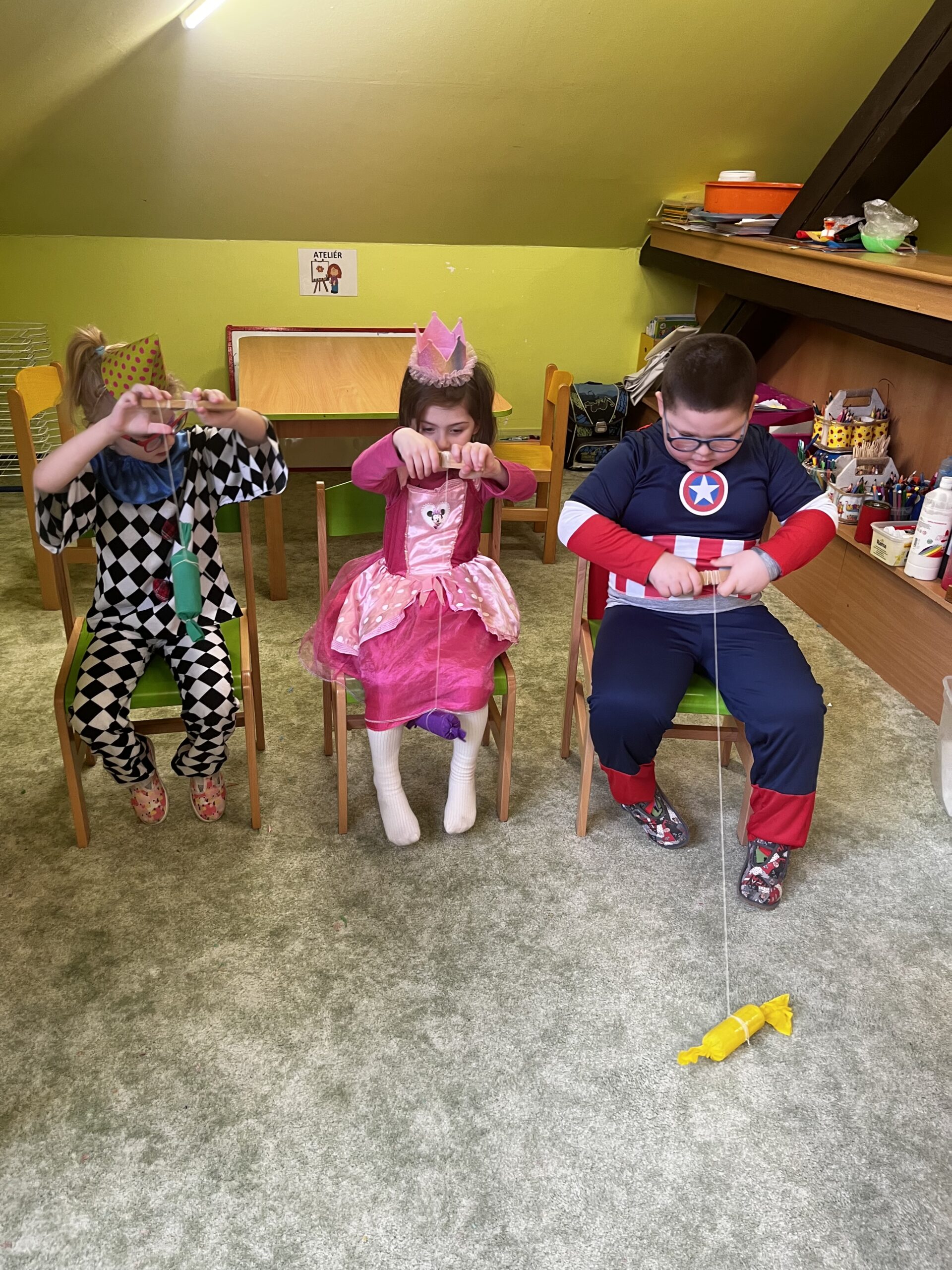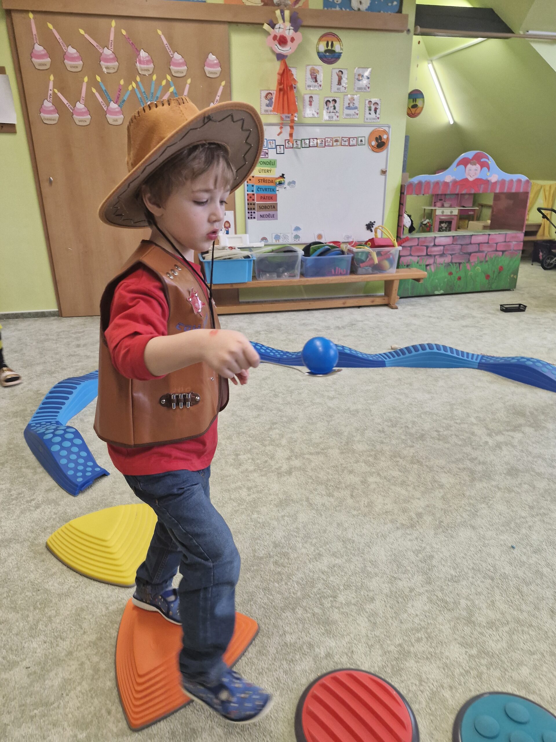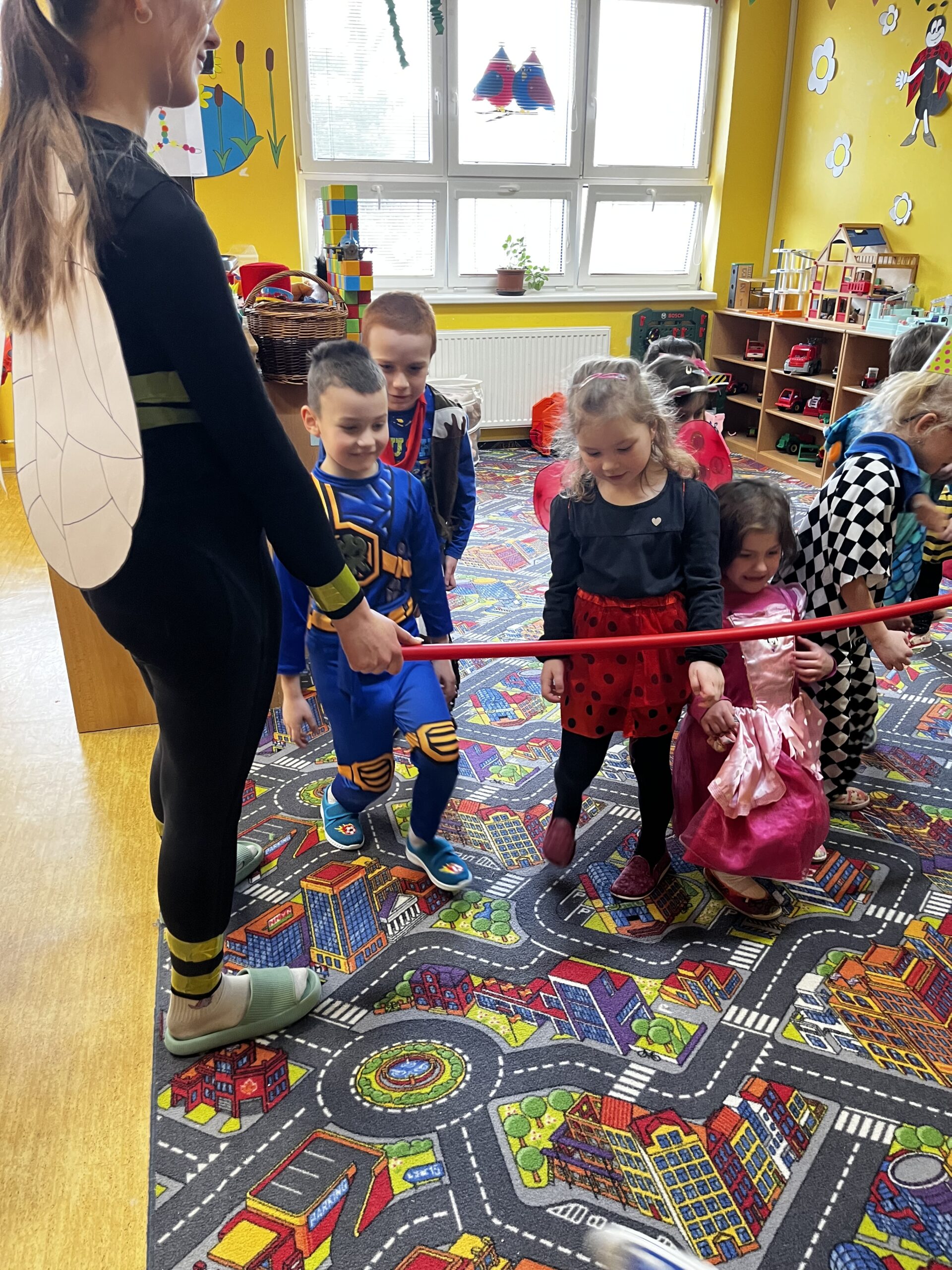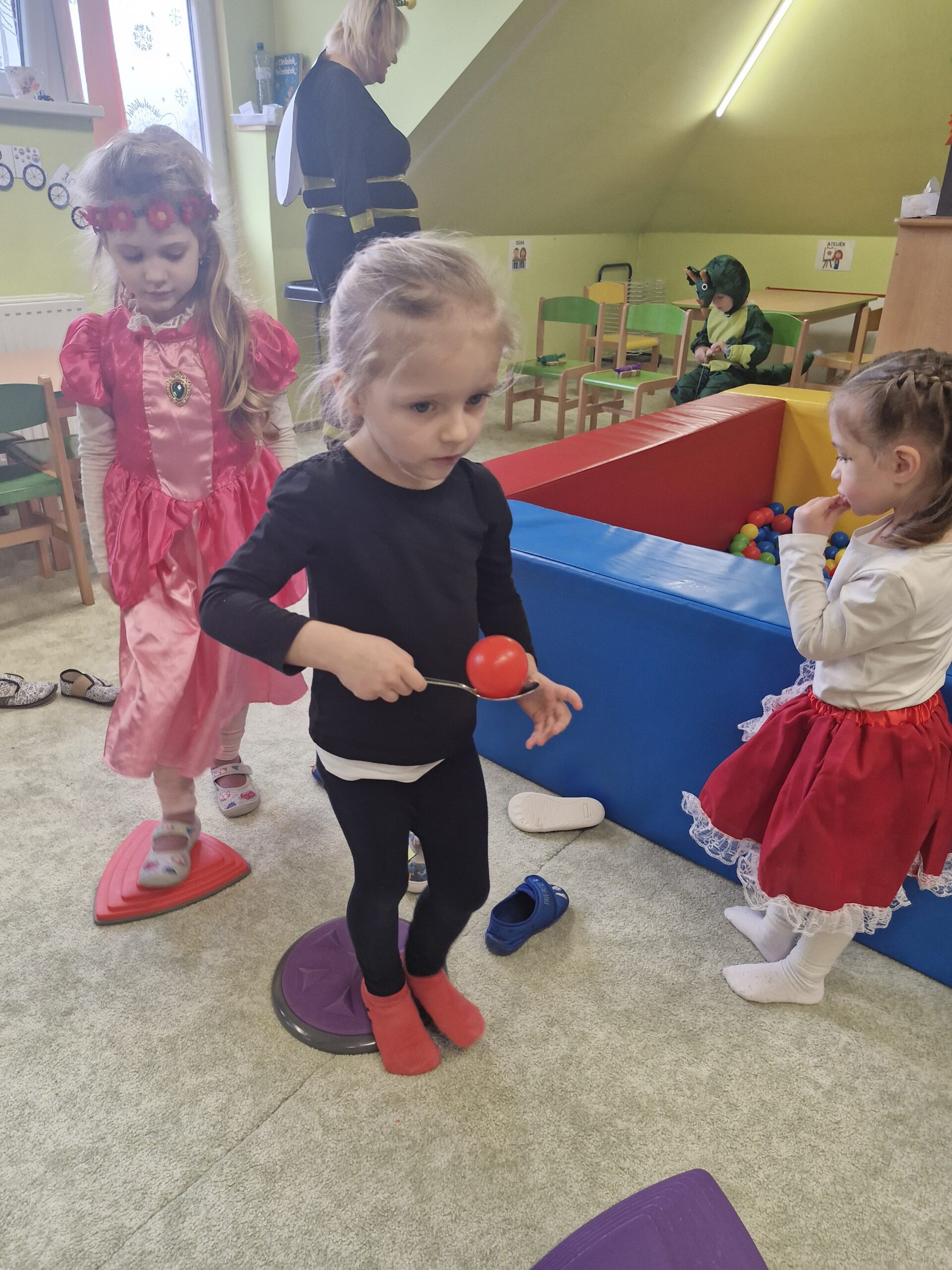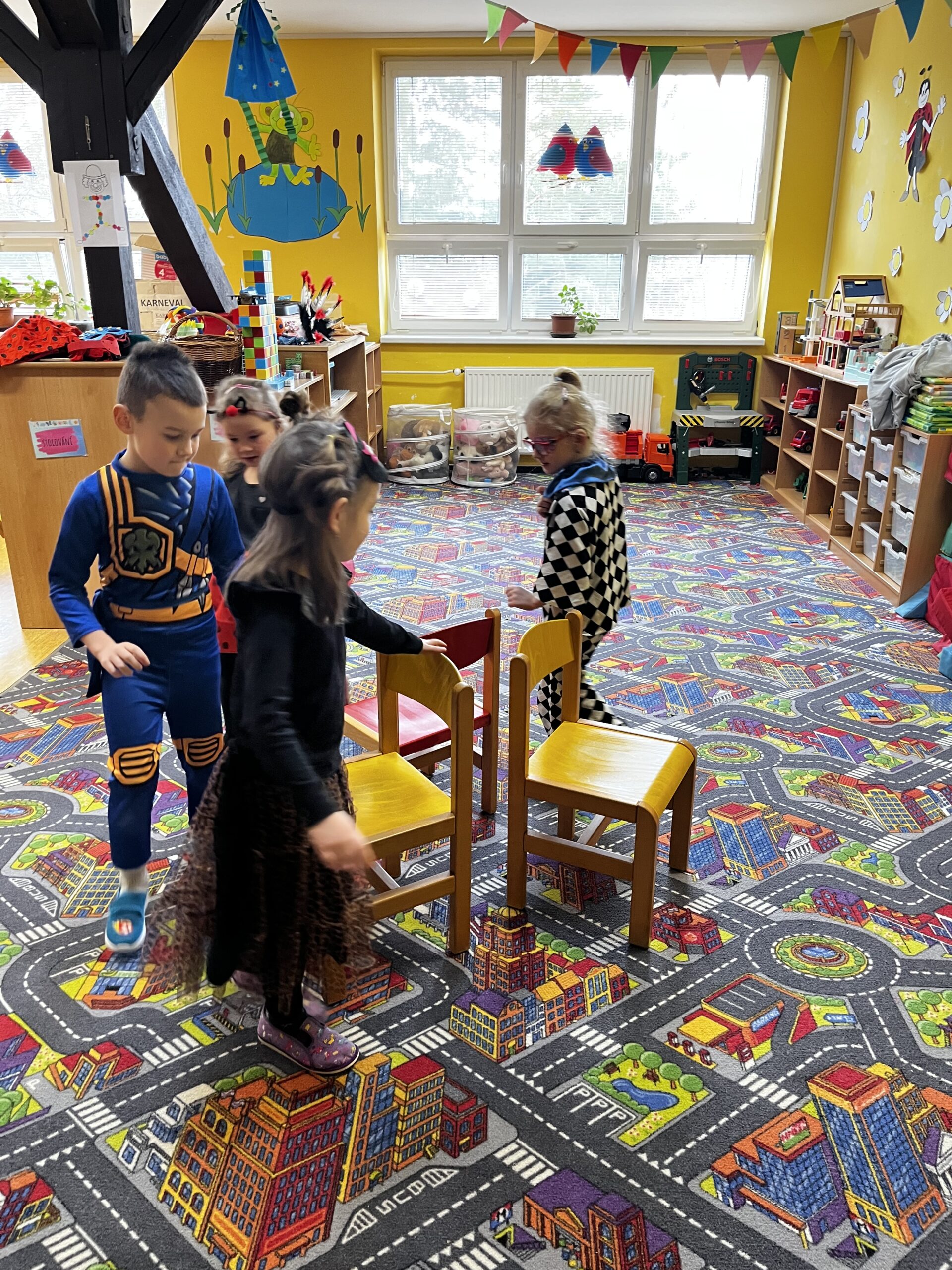 Poté děti pomáhaly pilným včeličkám s přenášením pylu do úlu a pustily se do plnění připravených karnevalových stanovišť. Děti postupně navštěvovaly jednotlivá stanoviště a vyzkoušely si například přenášení míčku na lžičce po vyznačené dráze, hod míčkem do šaška, hledání bonbonů v kuličkovém bazénku nebo namotávání bonbonu na provázek. Nechyběly ani oblíbené pohybové hry jako kloboukovaná, židličkovaná a prolézání pod tyčí.